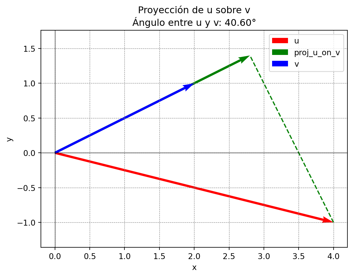 3. Encuentra el vector \(\mathbf{v}\) y comprueba que \[\mathbf{v}\cdot\mathbf{v}=||\mathbf{v}||^2.\] 4. Calcula el vector proyección de \(\mathbf{u}\) sobre \(\mathbf{v}\), es decir, \(\text{proj}_{\mathbf{v}}\mathbf{u}\).